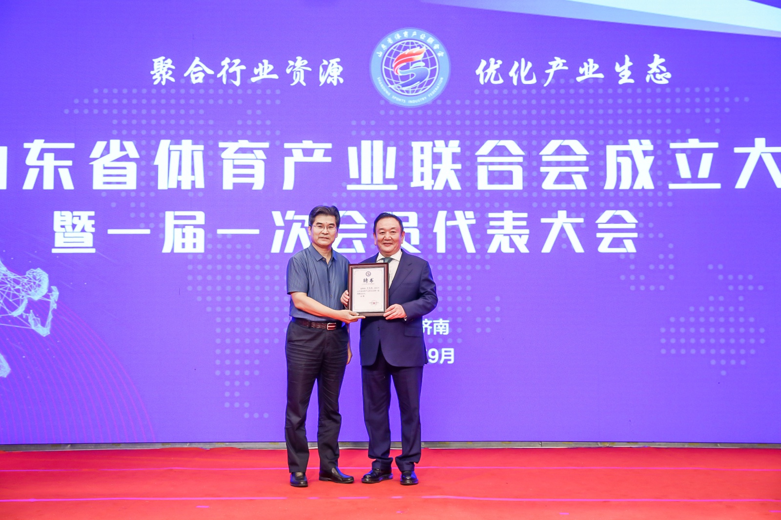 2020年9月16日,山东省体育产业联合会成立大会暨一届一次会员代表大会在山东济南隆重召开。中国体育用品业联合会主席李桦、山东省体育局副局长王延奎、中国文教体育用品协会副理事长张培生、中国体育用品业联合会副主席兼秘书长罗杰、山东省民政厅社会组织管理局二级调研员王军、山东省体育总会秘书处处长孙照亮、山东省体育局经济处处长徐金龙、山东省体育产业发展服务中心主任翟培建出席。山东省体育产业联合会近200名会员单位代表以及部分省市媒体共同参加。全国政协委员、好体育app官方下载产业集团董事长卞志良当选首届理事会会长并发表讲话。