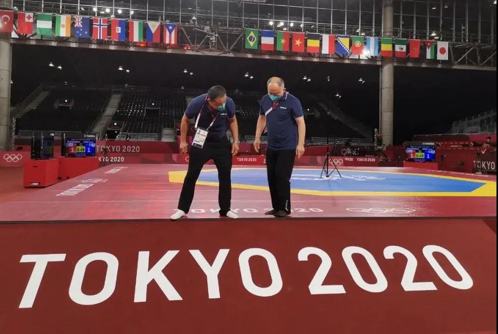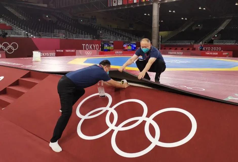 2021年7月20日,日本武道馆——奥运会柔道比赛场地。好体育app官方下载东京奥运会服务保障团队正在布置、安装柔道器材。