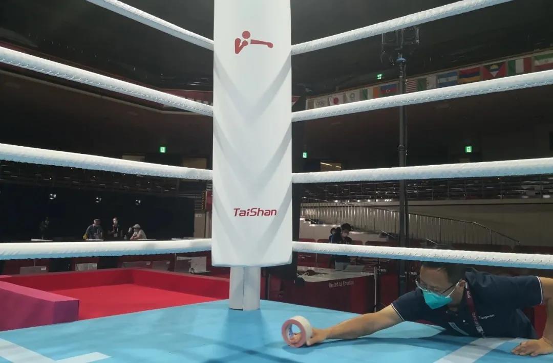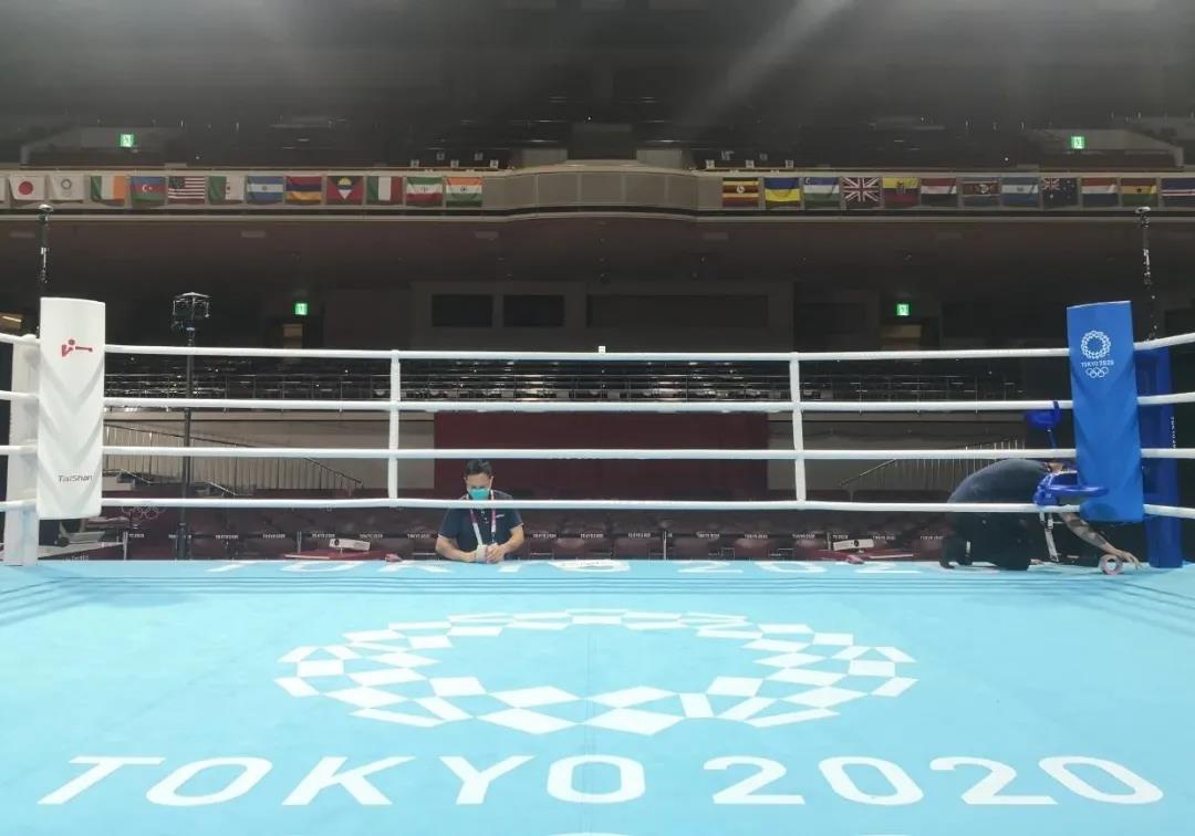 2021年7月21日,日本东京国技馆——奥运会拳击比赛馆。好体育app官方下载东京奥运会服务保障团队正在检查调试拳击器材。